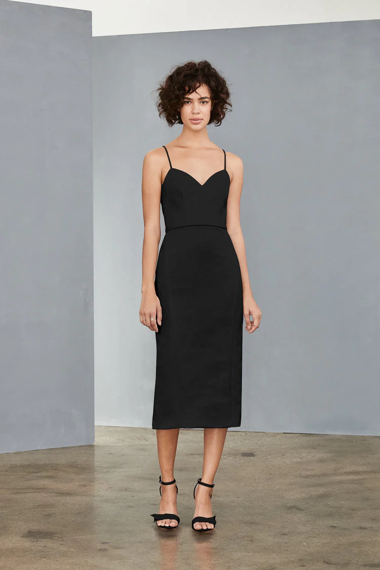 Faille camisole neckline sheath dress with back tailored bow details.