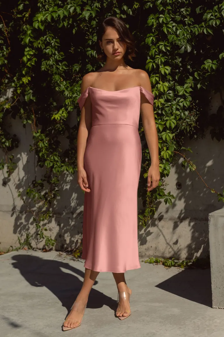 The Evelyn dress is characterized by gracefully draped off-the-shoulder sleeves and a gentle cowl neckline. Its slinky, bias-cut midi skirt elegantly follows the contours of your body, creating a flattering and chic silhouette.